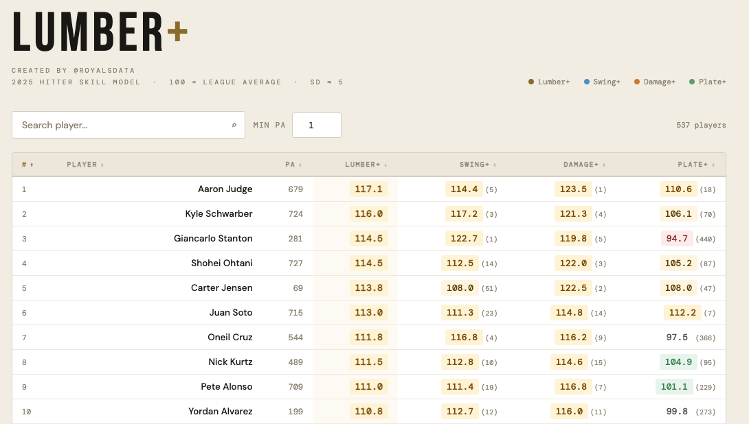 Lumber+ is not a stat; it won’t tell you what a hitter did in the box score. Rather, it measures underlying skills that drive offensive production over time.